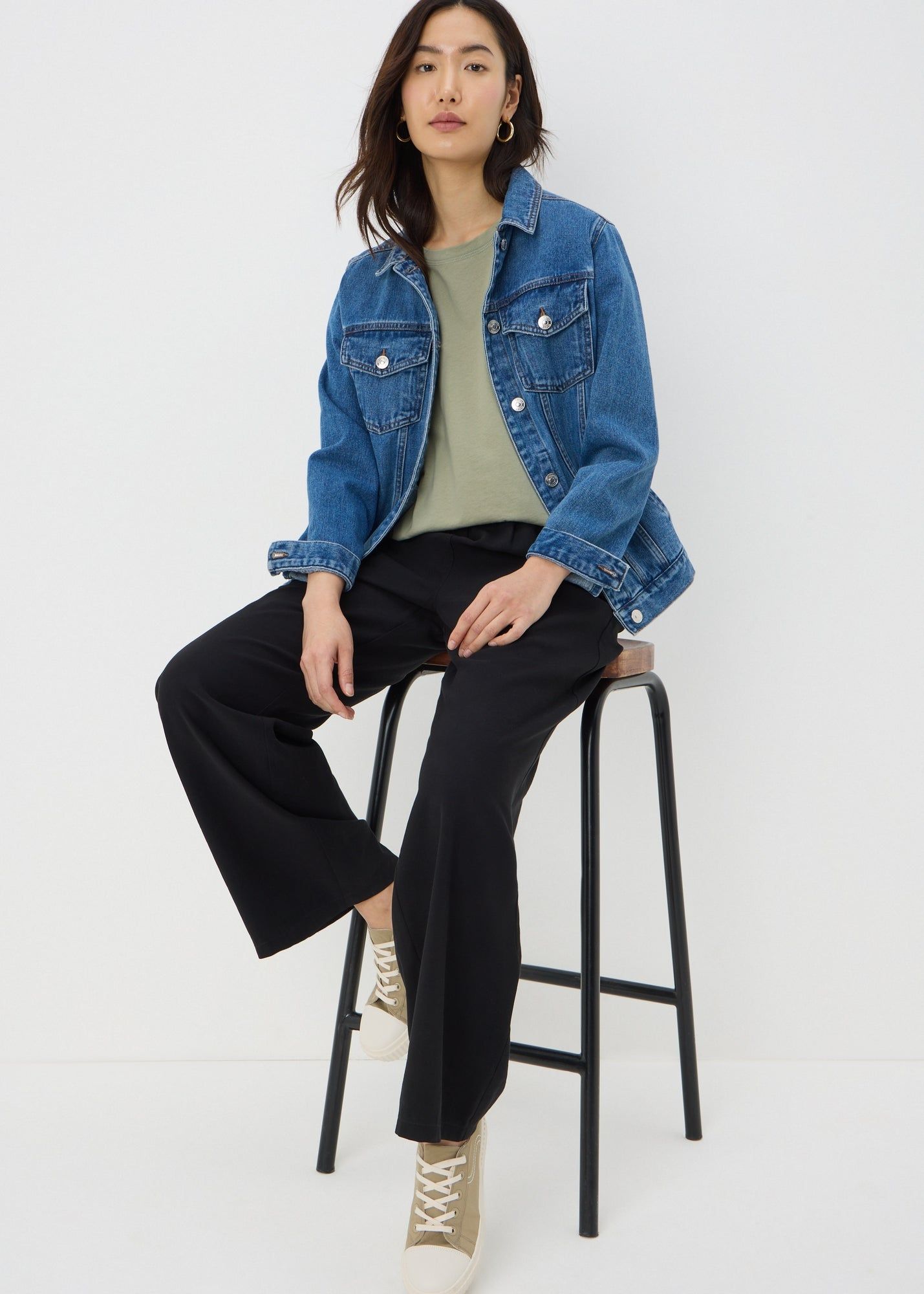 Don’t shy away from mixing proportions. A baggy denim jacket paired with wide-leg jeans gives you that model-off-duty edge, while a cropped jeans jacket with a flowy skirt can highlight your waist and add structure to a feminine silhouette. Try bFab’s stretch black denim jacket with a cotton midi skirt and stripe fitted t-shirt for a simple yet fashion-forward outfit.