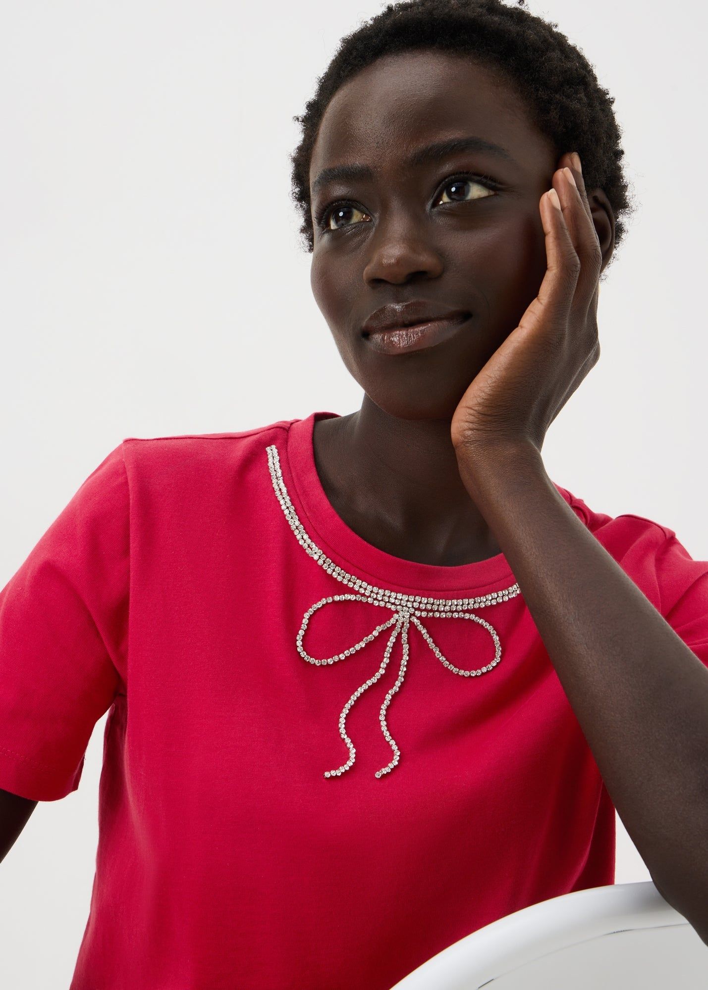 Playful and festive, this red bow t-shirt adds charm to casual Christmas looks. Perfect with denim or layered under a blazer for relaxed holiday styling.