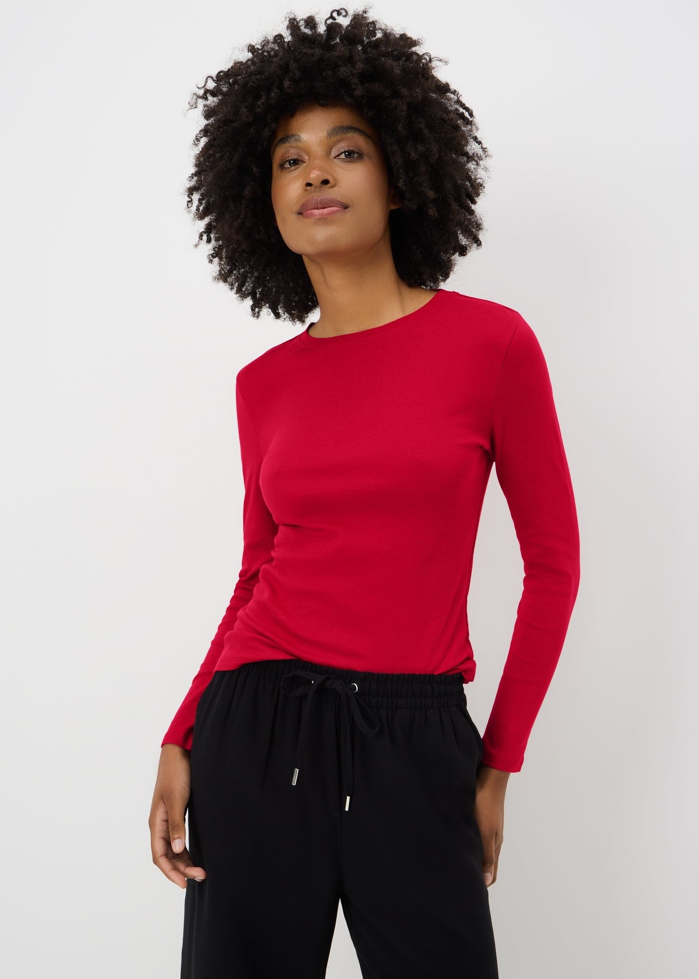 A versatile festive staple, this fitted red long-sleeve t-shirt is ideal for layering or wearing solo. Comfortable and flattering, it works well for casual Christmas outfits or styled under jackets and blazers.